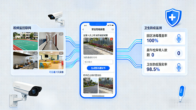 智慧托育 + 监管系统,聚焦 “透明化、智能化监管” 的核心模块,链接政府监管部门与托育机构,覆盖 “事前合规审核、事中动态监控、事后整改追踪” 全流程,既解决监管部门 “线下检查效率低、数据滞后” 的痛点,也帮助机构 “合规管理更轻松、风险早规避”。