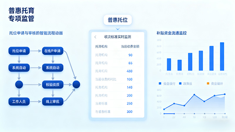 普惠托位审核:机构在系统提交普惠托位申请,监管端审核通过后,系统标记 “普惠托位”,实时监控 “是否按普惠标准收费”。