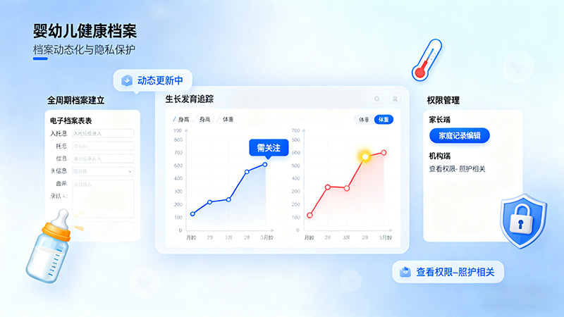 健康数据加密存储,访问权限分级管控,确保隐私安全;同时满足监管部门对托育机构健康管理的合规要求