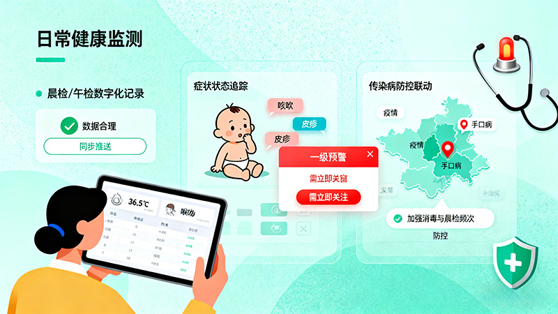症状动态追踪:对出现轻微症状的婴幼儿,支持教师记录症状变化,系统根据症状组合触发分级预警。