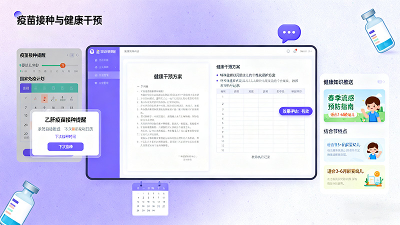 疫苗接种提醒:根据婴幼儿年龄与国家免疫规划,系统自动推送疫苗接种提醒,接种后系统更新档案并标记下次接种时间。