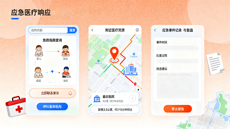 急救指南查询:内置婴幼儿常见急症的急救流程图,教师可通过关键词快速检索,同时可通过系统联系家长与急救机构。