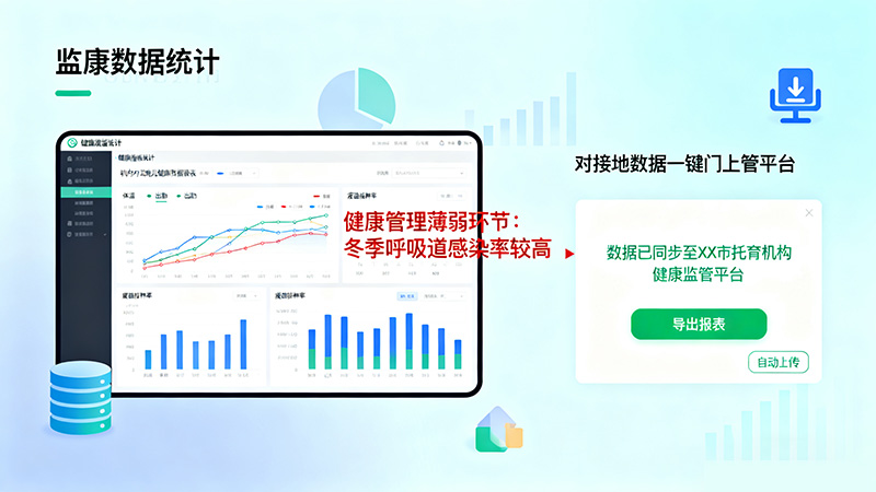 监管数据一键上报:对接地方卫健部门的托育机构健康监管平台,支持按要求导出或自动上传健康管理数据。